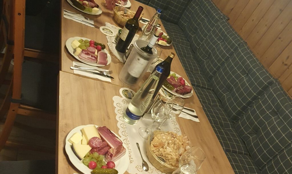 Es gibt pro Person eine reichhaltige Portion mit verschiedenem Speck, Salami, Käse, Brot und Butter, Kaminwurzen, Weintrauben, Maroni usw., für die wir € 16,50 kassieren müssen.