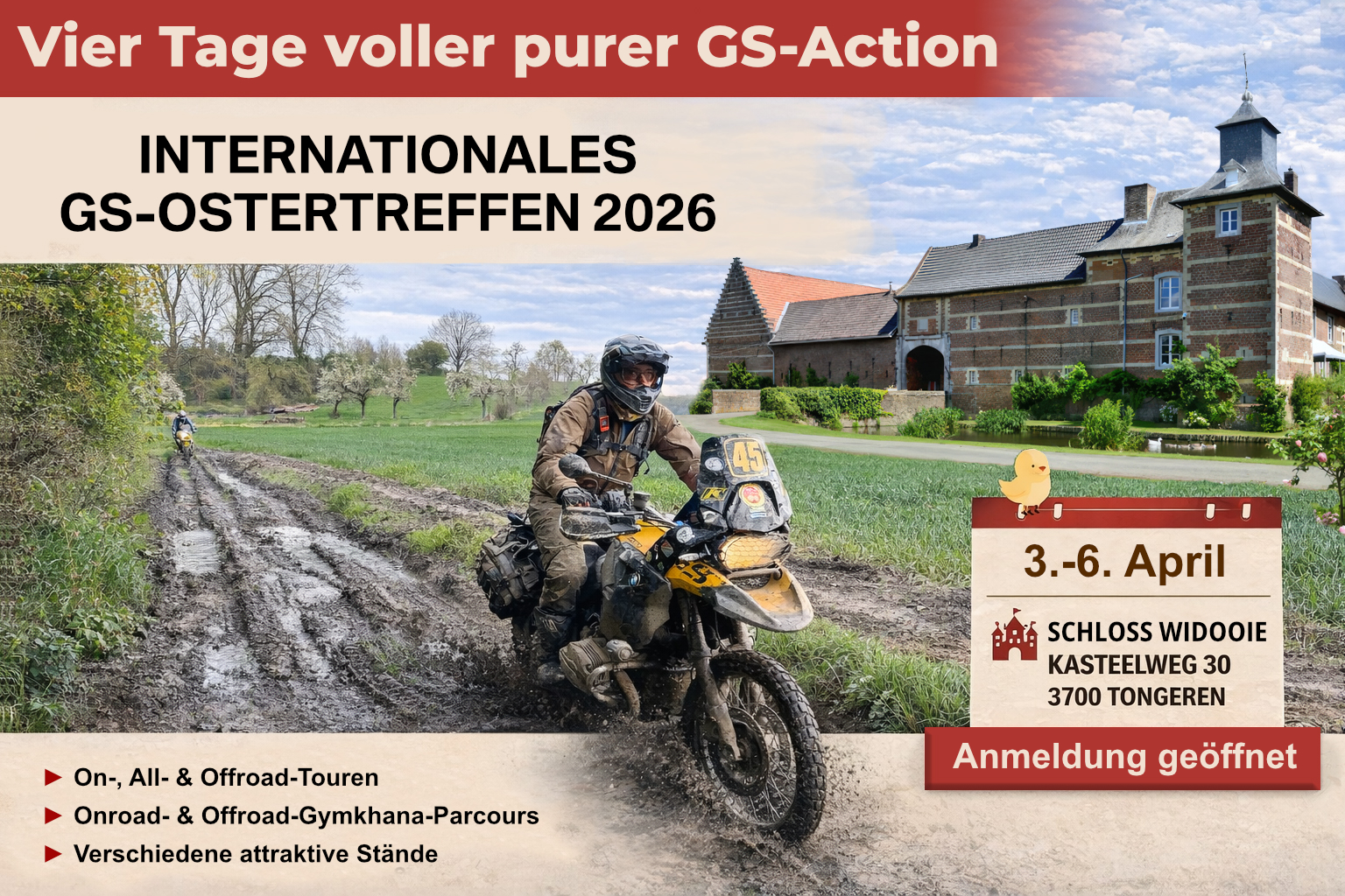 Kasteel Widooie Kasteelweg 30, Tongeren, Flandern, BelgiumVom 3. bis 6. April 2026 treffen sich GS-Fahrer aus dem In- und Ausland am Schloss Widooie zum Internationalen GS-Ostertreffen. Vier Tage voller Fahrspaß, Begegnungen und Genuss – alles, was das GS-Fahren so besonders macht: geführte Offroad-Touren, Gymkhana, Trainings, Ausstellerstände,[...]